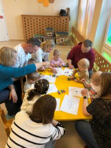 Dzieci i rodzice razem tworzyli „wiosenną łąkę” – malując farbami, odbijając kształty i eksperymentując z kolorami. Wspólne tworzenie pozwoliło dzieciom wyrażać emocje i jednocześnie budować relacje z rodzicami.