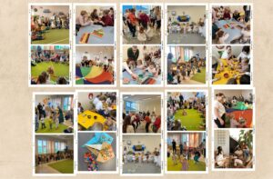 Kolaż zdjęć przedstawiający dzieci uczęszczające do żłobka podczas wspólnych zajęć i zabaw z udziałem opiekunów oraz dziadków Dzieci biorą udział w aktywnościach ruchowych, plastycznych i integracyjnych w salach żłobka, m.in. tańcach, zabawach z chustą animacyjną oraz pracach manualnych. Zdjęcia ukazują atmosferę współpracy, radości i zaangażowania w codzienne życie placówki